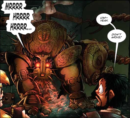 When the ascendant Lady Heterodyne and her various friends and minions finally succeed in fully restoring ✣ The Castle's power, it is able to reassert control of the Fun-MADDs. Additionally, after some of Team Agatha transfer ✣ the consciousness of Muse of Protection Otilia into an upgraded ✣ Fun-MADD, she also can control the other Fun-MADDs to a point ✣ . This is fortunate, as the aforementioned bridge plan gets disrupted by unforeseen events, and Otilia arrives just in time to save Gil and Tarvek from being Devil Dog chow.