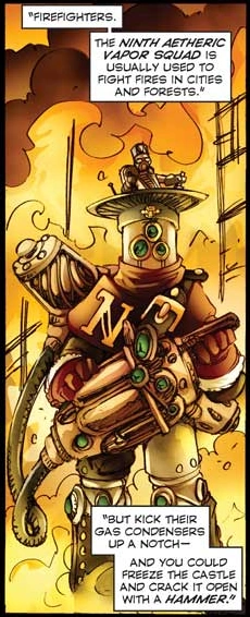 The Ninth Aetheric Vapor Squad are an elite firefighting unit of the Wulfenbach forces.[1] Their name, "Aetheric Vapor" is a poetic allusion to the chill of the upper atmosphere (from Latin æther (“‘the upper pure, bright air’”) < Ancient Greek αἰθήρ (aithēr), “‘upper air’”) < αἴθω (aithō), “‘I burn, shine’”)[2]), since they use gas (possibly nitrogen) condensers mounted on giant clanks to literally freeze the fire in place. Not only is the fire smothered instantly by a lack of oxygen, but any subsequent heat/heat transmittal damage is also quenched.