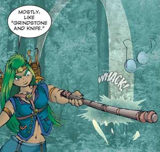 Zeetha, daughter of Chump, lost royal princess guardian of the lost city of Skifander[2] is Agatha's traveling companion and has the unique relationship to her of "Kolee-dok-Zumil." She's easy to pick out in a crowd, with her waist-length green hair, gold-tinged skin, two unusual swords, and an occasional glimpse of what some readers call "the navel of death," not without reason. Her canine teeth are almost long enough to be properly called fangs.